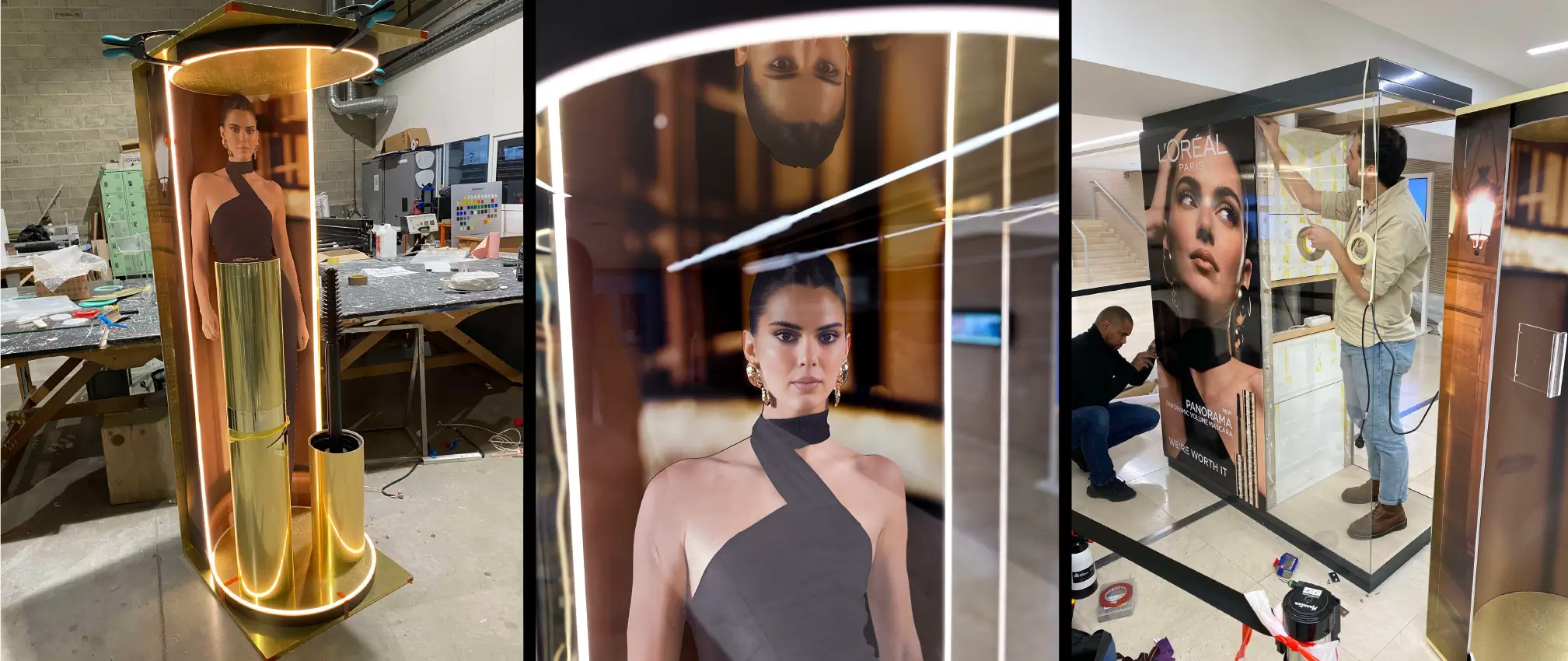 With this window display i had to represent the new Panorama campaign spirit at the brand’s headquarters in Clichy. The objective was to promote Kendall Jenner as the brand ambassador to the public. The Cutout helps strengthen the empowerment side of the campaign with a meaningful quote. The light base enhances the elements and allows to play with the reflection of gold and the dummy. Located at the entrance to the building, this window gain momentum at sunset with the contrast that operates with gold.