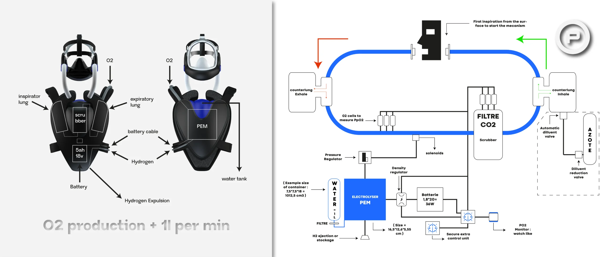 The X-MARE project is a portable equipment using this technology. It allows to generate oxygen in real time thanks to an electrolyzer (device which uses electricity to divide water H2O into O2 and H2) placed in the plastron, the system of gas exchange in the backpack and the mask connected to it. All forming a rebreather of a new kind, transportable and meeting the needs of diving professionals.